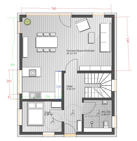 • Der Durchgang in die Küche muss wegen eines Rollstuhlfahrers mindestens 1m sein.