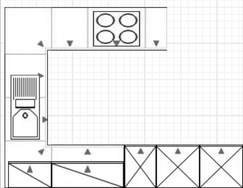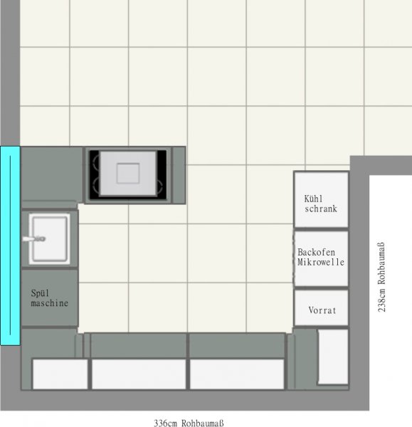 Wandzeile: tote Ecke, 80cm US im Raster 1-1-2-2, 90cm 1-1-2-2 mit Kochfeld, 30cm US für Handtücher, Tabletts und Schneidebretter.