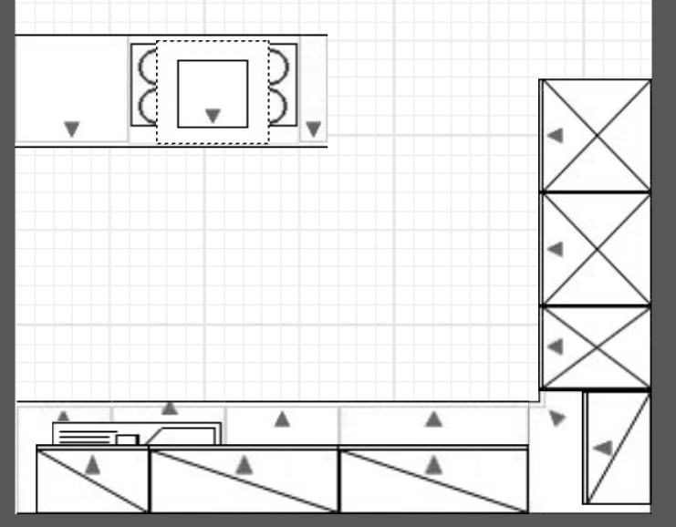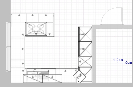 • Wir haben nun zwei tote Ecken. Es stand zur Debatte, unten Links ein Rondell zu verwenden. Dadurch würden die zwei 100cm-Schubladen zu einer 90cm und einer 80cm-Schublade und die Kochinsel weiter in den Raum reingeschoben. Gibt Stauraum, aber irgendwie auf Kosten der Zugänglichkeit.