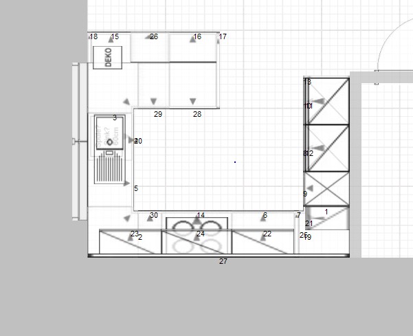 Dazu ist zu beachten, dass die in den Raum rein reichende Arbeitsplatte 90cm werden soll (konnte ich im Planer nicht umsetzen). Auch war es angedacht, statt der Toten Ecke oben links in den Essbereich einen Schubladenschrank für Besteck etc. einzubauen.
