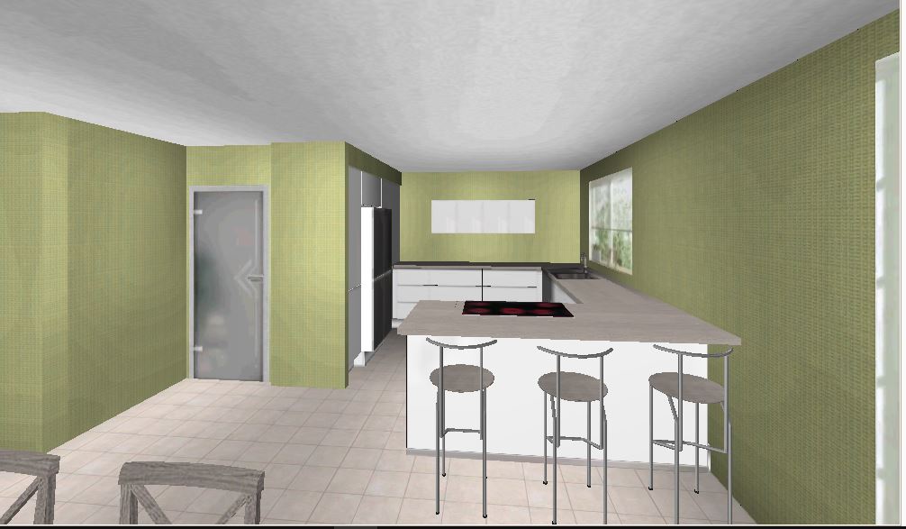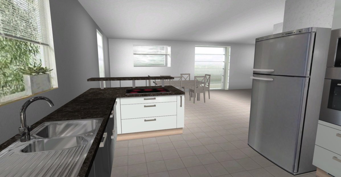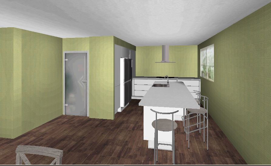 Dann kann man die ganze lange Seite planlinks mit Seitenschränken durchmöblieren und wieder den Flugzeugträger frei in den Raum stellen. Mit oder ohne Möblierung planunten - wenn man Planunten dann das Kochfeld an die Wand zum Bad setzt, wird es eine normale Spüleninsel ca 12x200-260, welche deutlich weniger weit in den Raum Richtung Essen ragt.