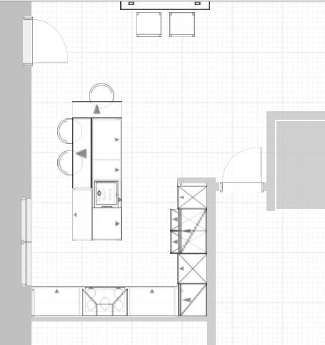 • Die untere, rechte Küchenecke mit dem Übergang von Seitenschränken zu den Unter-/Oberschränken ist noch nicht gut gelöst.