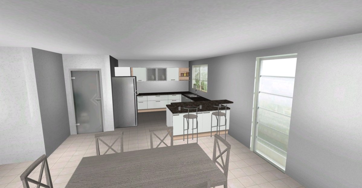 der Küchenraum ist fast quadratisch und schwer zu möblieren. Zumindest mir fällt dazu recht wenig ein, will man die Wünsche erfüllen. Dazu gehört, das "in Richtung Wohnraum kochen".