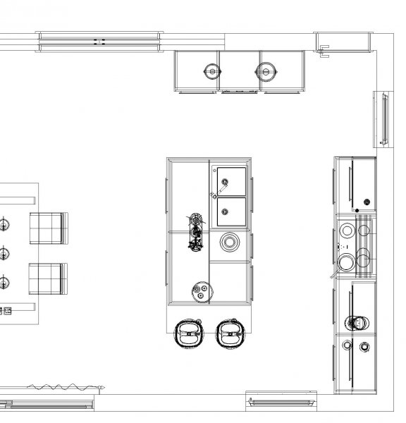 Ich finde den Ansatz Spülen/Arbeitsinsel schon gut. Auch die Sitzposition finde ich passend.