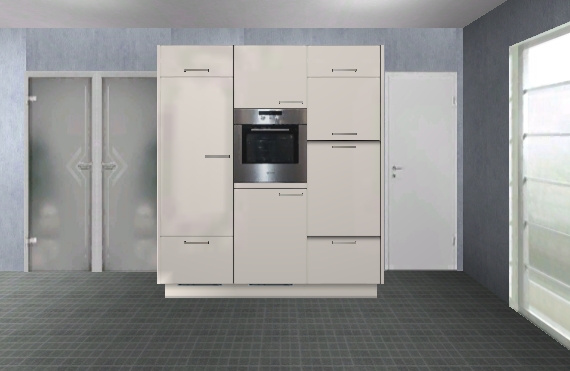 Unter dem Backofen würde ich die Drehtür lassen. Denn dort wird auch der Wasseranschluß für die GSP positioniert werden müssen. Und, man kann dieses Drehtürfach dann eher mit senkrechten Einteilungen versehen, um z. B. gerade nicht benötigte Backbleche oder Schneidbretter, Tabletts senkrecht einzustellen. Das sollte mit dem Wasseranschluß hinten drin problemlos funktionieren. So, wie im Beispiel oben links.