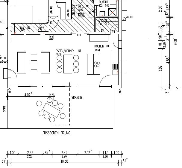 Der Raum selbst ist 10.38m lang. Im Planer waren nur 9m möglich.