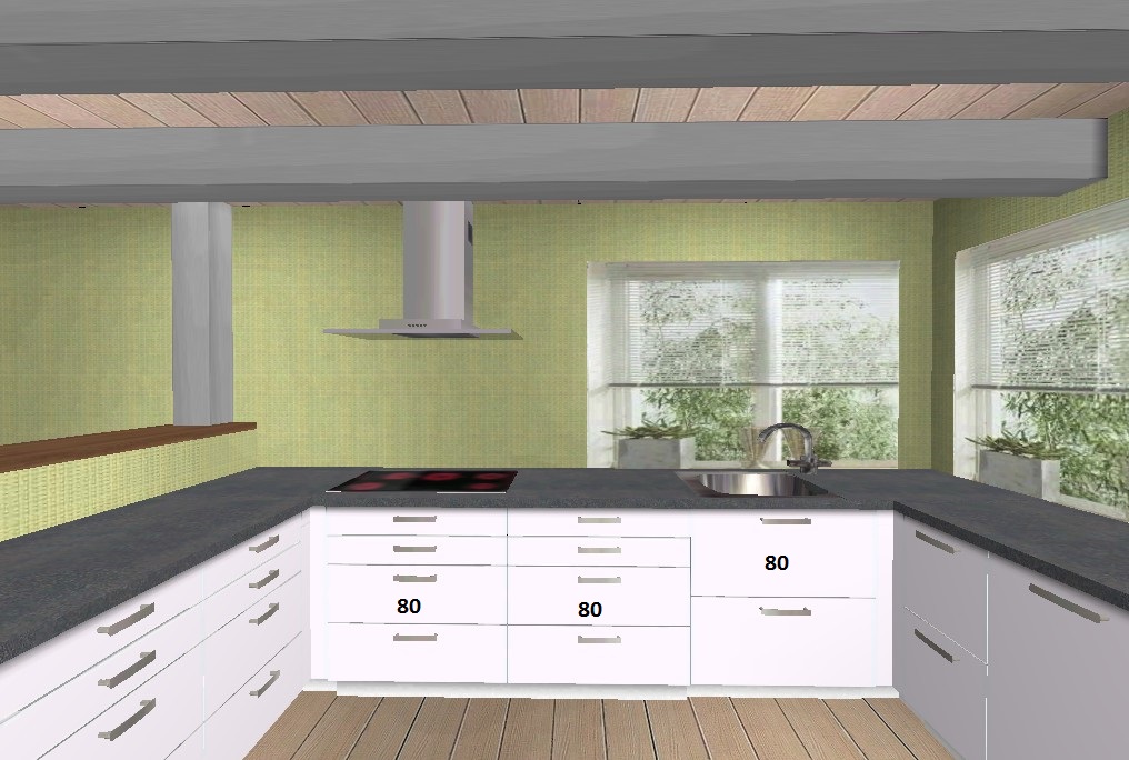 Meine aktuelle Überlegung ist es den Block am Tresen (Plan links) auf 100cm zu setzen und den Rest auf 90cm um diesen dann in die Fenster laufen zu lassen.