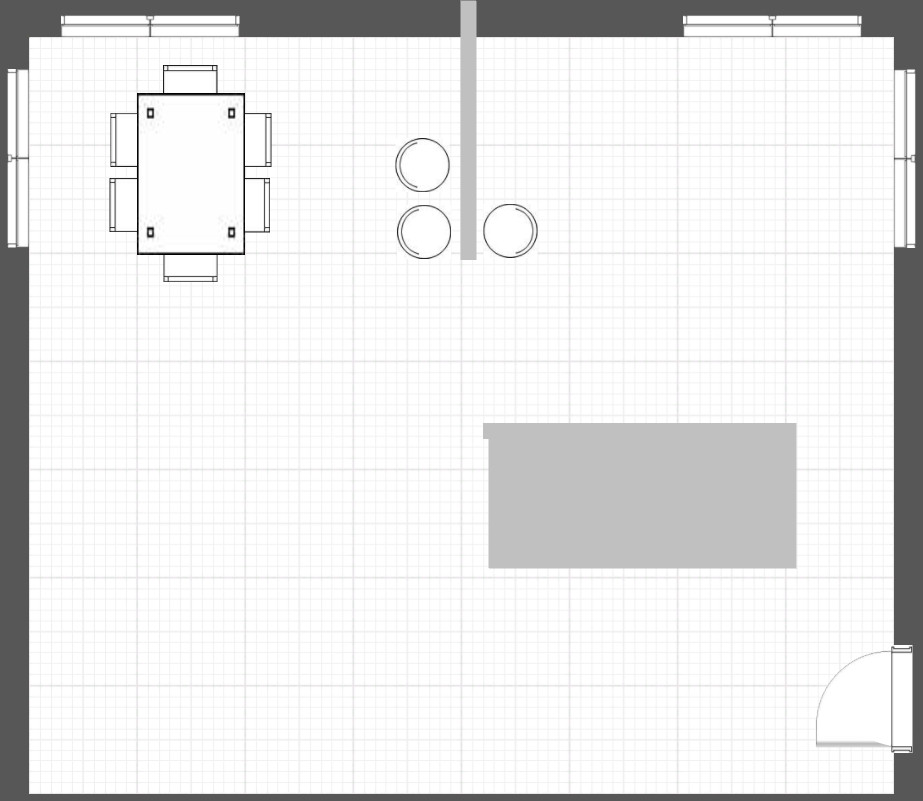 Der Vorschlag von Evelin gefällt mir eigentlich sehr gut. Leider habe ich mich bei den Maßen des Tresens vertan. Dieser ist 225cm lang und damit ist der Durchgang nur noch ca. 77cm. Habe einen der Hochschränke entfernt.