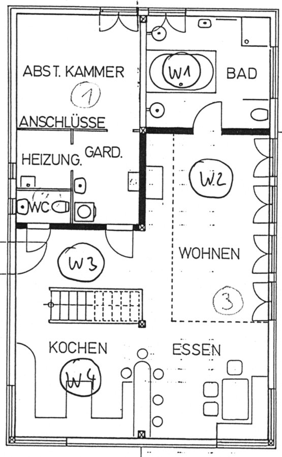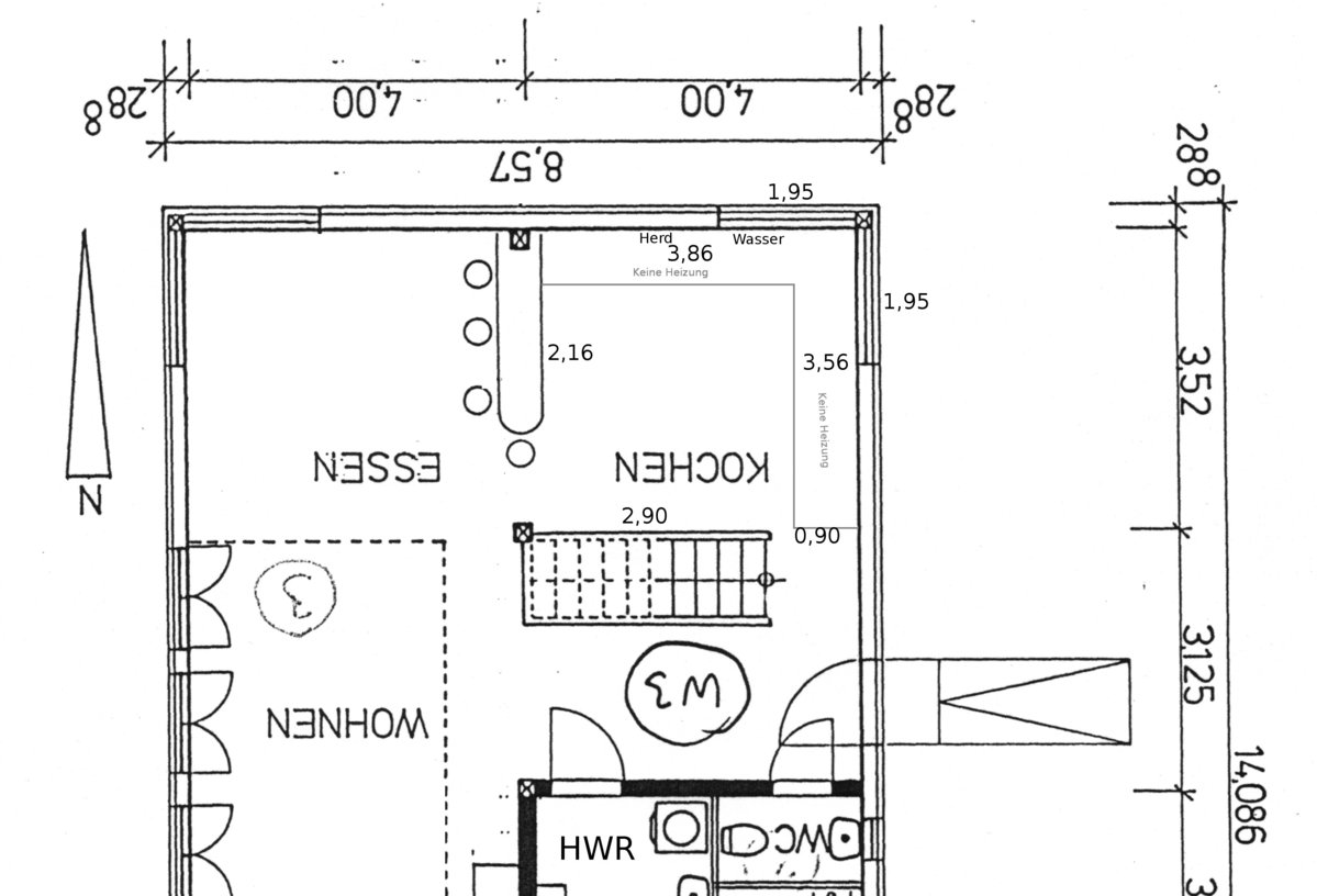 Zwischen der Küche und dem Essbereich befindet sich ein ca. 120cm hoher Tresen/Bar. Das Erdgeschoss verfügt über Fußbodenheizung. Der im Grundriss eingezeichnete Bereich im Norden und Osten der Küche ist nicht beheizt. Der Wasser- und Herdanschluß befindet sich auf der Nordseite. Beide Anschlüsse, sowie die Steckdosen sind veränderbar.
