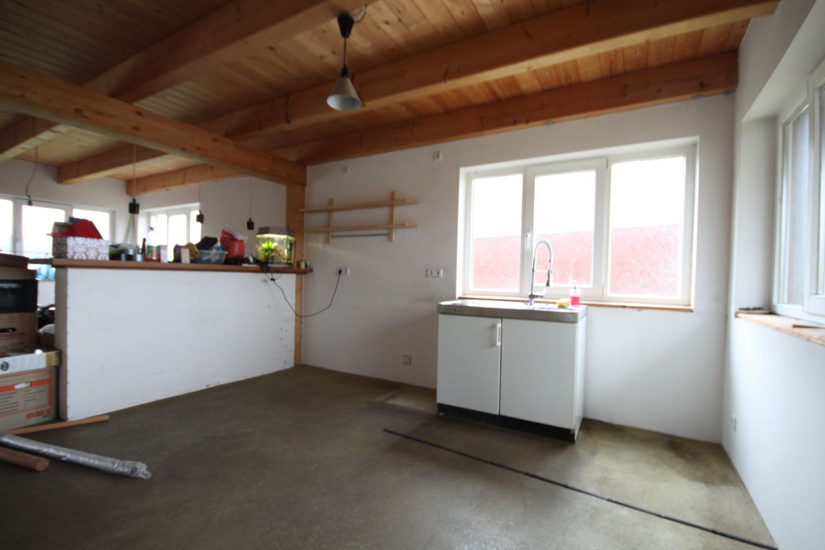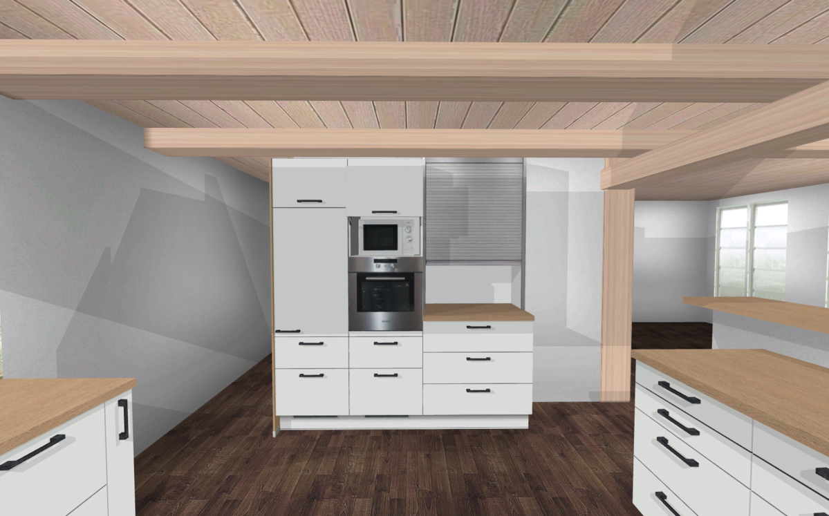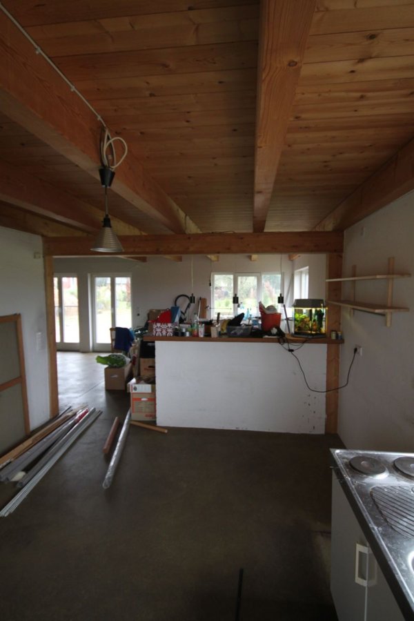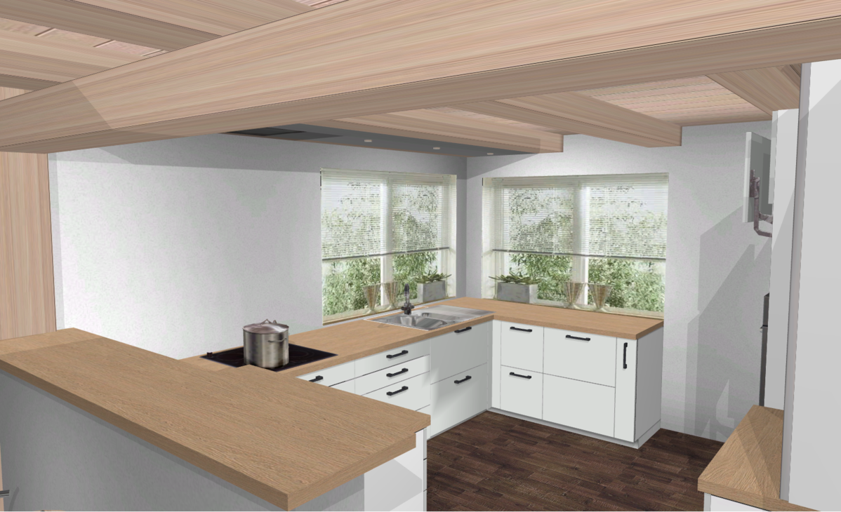 Die Fenster sind ca. 170cm breit und dreiflügelig, wobei sich nur der mittlere Flügel öffnen lässt. Zur Zeit existiert noch Abluft für DAH, aufgrund des Kamins muss da dann ja auch eine entsprechende Vorkehrung getroffen werden. Die Küchendecke besteht wie im gesamten Haus aus Holzdielen. Meine Idee war es die Decke auf der Nordseite zwischen den Balken abzuhängen und dort eine Decken-DAH und Beleuchtung zu integrieren.