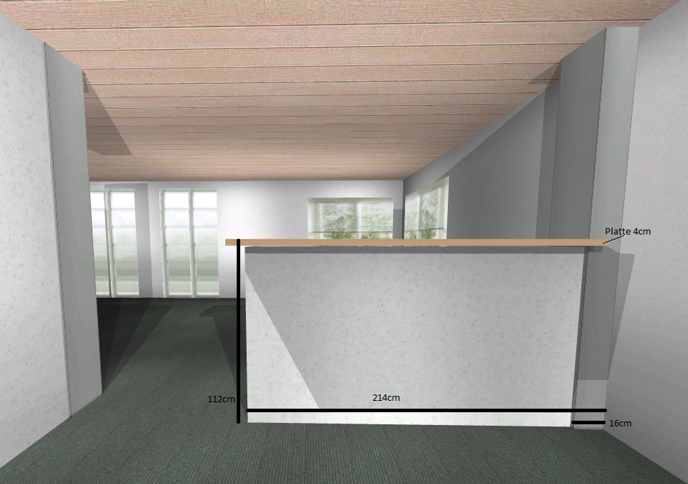 Der Tresen selbst ist genau in der Mitte des Hauses unter der Mittelpfette. Daher müsste die Breite des Sockels, der ist gemauert und weiß gestrichen, etwa 28cm sein. Aber genau kann ich das nicht sagen und muss noch mal messen (noch nicht in den Alno plan üebrnommen). Die 386cm von Ost-Wand bis Tresen stimmen aber. Auf dem Tresensockel befindet sich eine 4cm massive Eichenplatte.