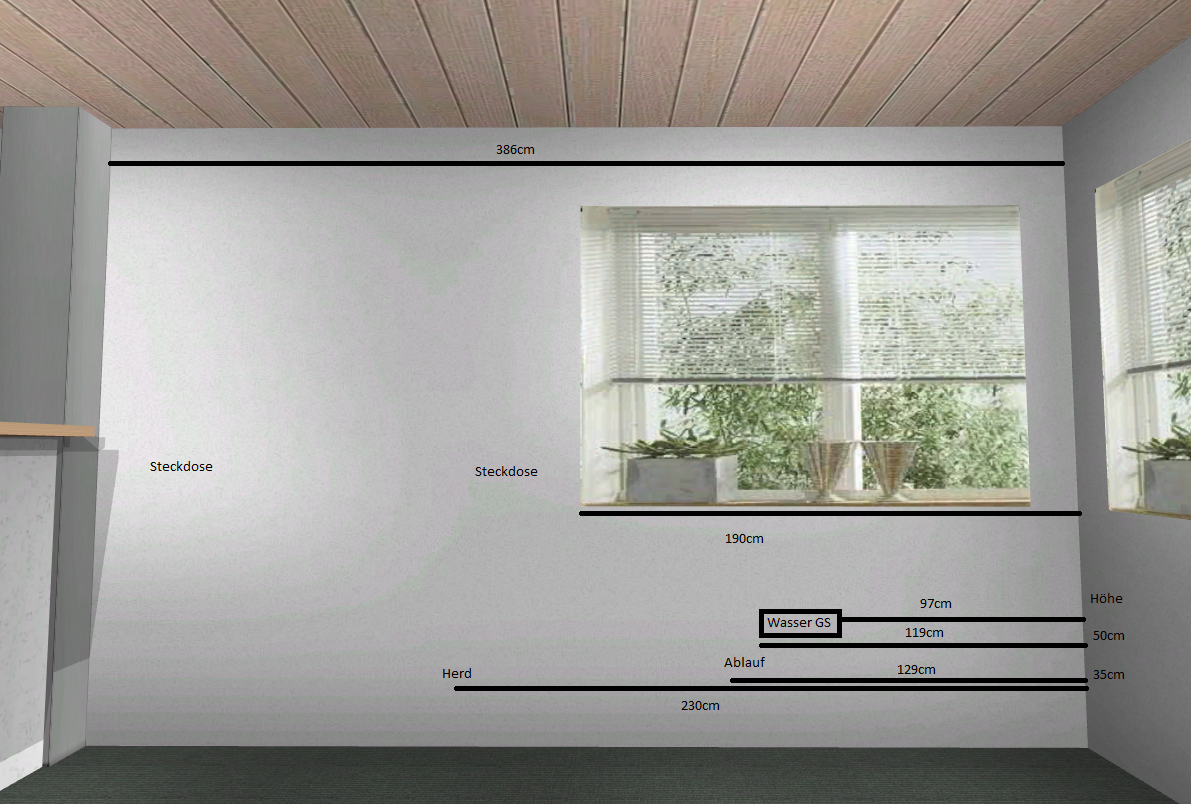 Der Wasseranschluss befindet sich ca. 120cm und der Herdanschluss bei ca. 250cm von der Ostwand entfernt an der Nordwand. Am Wochenende kann ich das noch mal nachmessen.