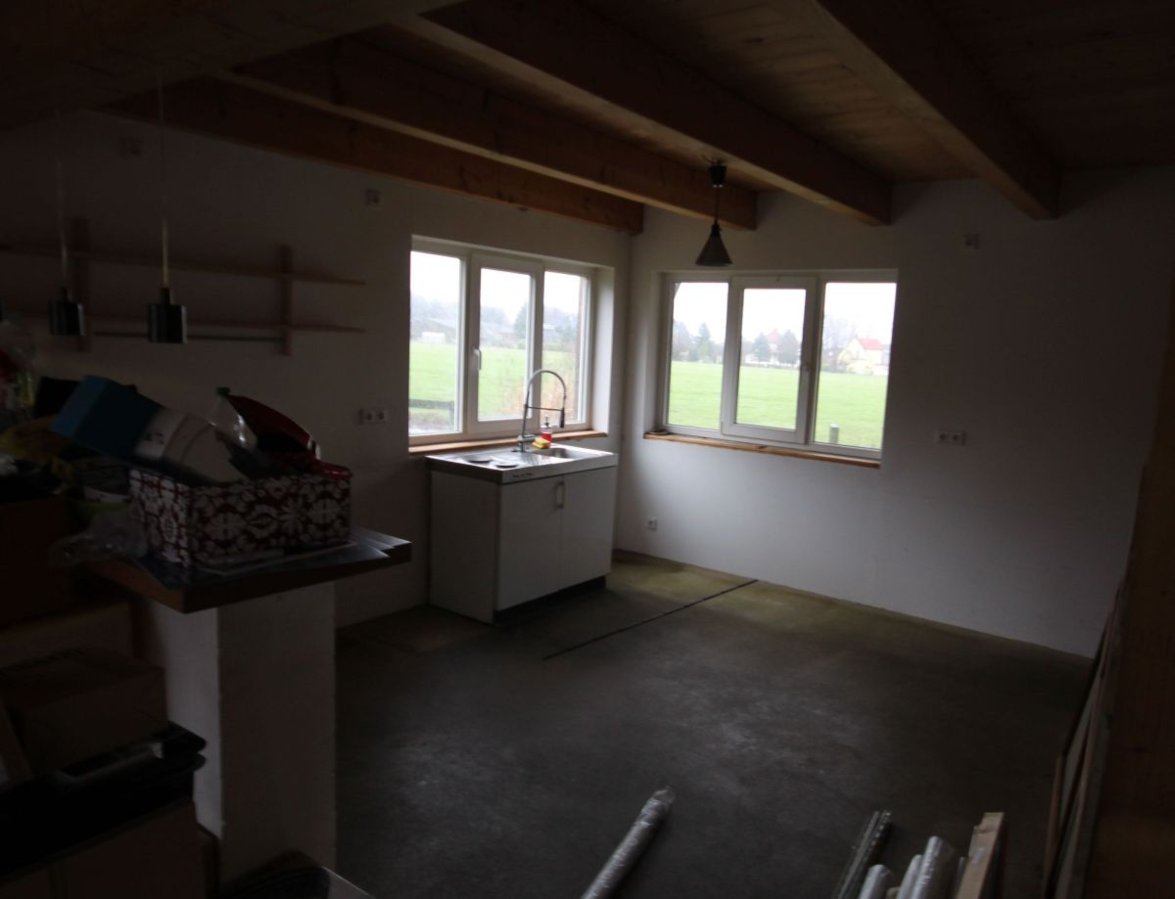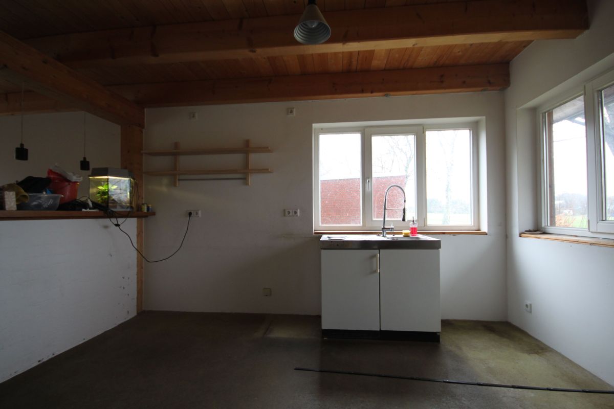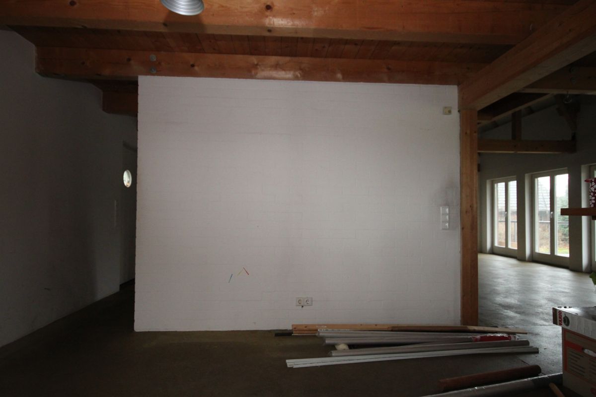 Den Wasser und Herdanschluss hatte ich absichtlich nicht gemessen, da dieser noch versetzt werden kann. Im Fußboden an der Nord- und Ostwand befindet sich keine Fußbodenheizung. Der Fußboden selbst ist gefärbter und geschliffener Estrich. Bei bedarf kann dieser noch zum verlegen der Anschlüsse genutzt werden.