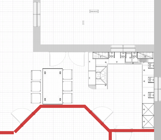 Das Kochfeld sollte bei einer Halbinsel aber 90 cm Arbeitsplattentiefe spendiert bekommen. Ihr habt da noch einen Tresen angedeutet ... ragt der nicht in den Öffnungsradius von den Terrassentüren? Und, der Esstisch ist gleich daneben?
