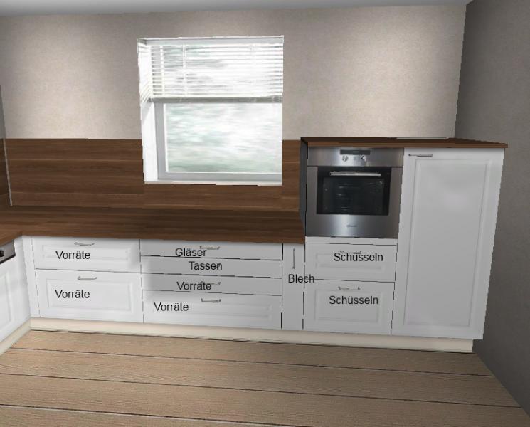 vielen Dank für eure Hilfestellungen und Anregungen. Ich habe es mal versucht weitestgehend im Alno Planer umzusetzen. Mit Schublade hab ich es nicht bekommen ein Kochfeld einzusetzen. Die Abzugshaube deutet es ja an was da sein soll.