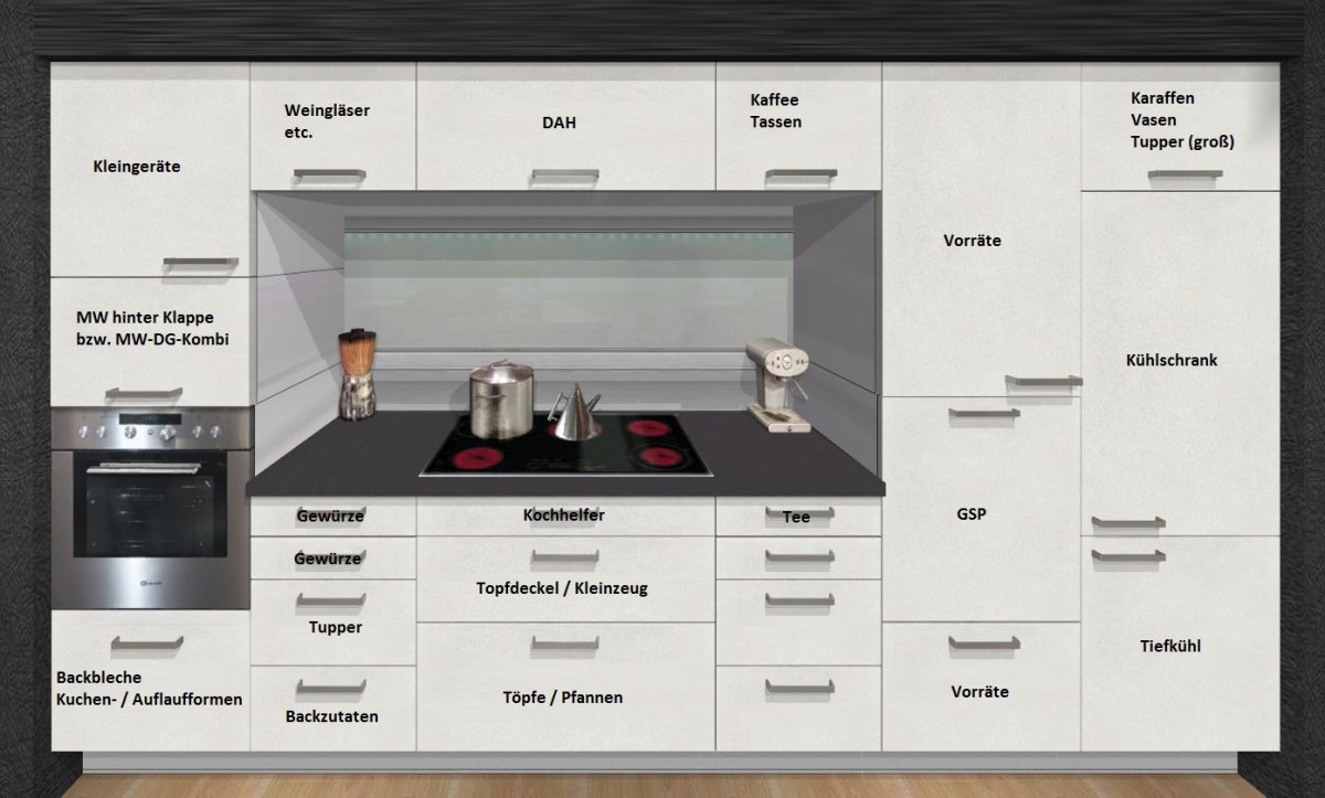 Was soll in der Küche außer den Standards untergebracht werden?: Geschirr komplett (nichts in Ess-/Wohnzimmer)