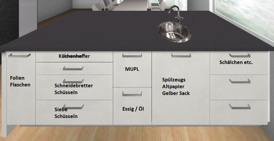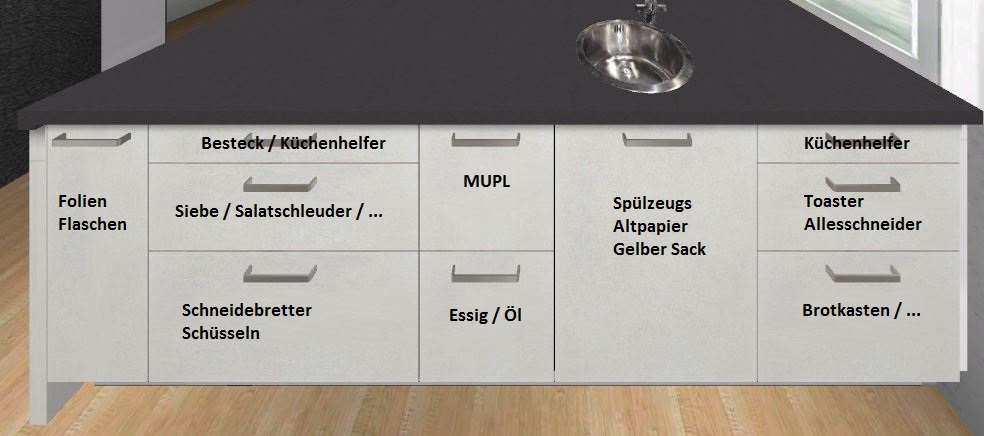 Beim Spülenschrank wäre mir 3-3 lieber, aber es sollen hier neben der Müllbehältern und einer Innenschublade auch die Geschirrtücher auf Haltern untergebracht werden. Hab ein bißchen im Forum gesucht, das scheint mir die vernünftigste Lösung für die Geschirrtücher zu sein.