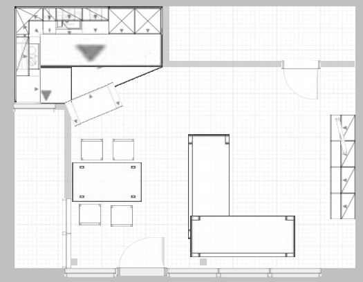 Wir haben jetzt also die Schränke nochmal ein bisschen umsortiert und kamen bei dieser Lösung raus. Der Kühlschrank müsste dazu ein paar cm nach vorne gerückt werden, damit dahinter das Wasser zur Spüle geführt werden kann.