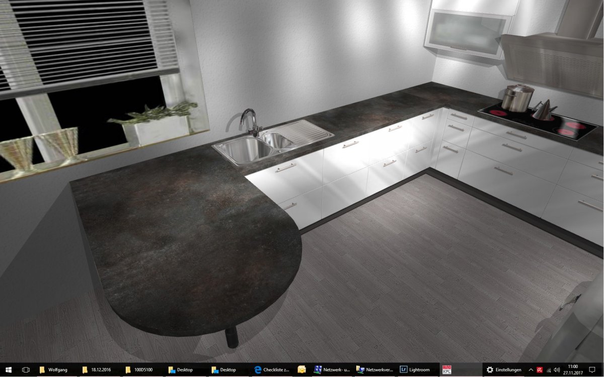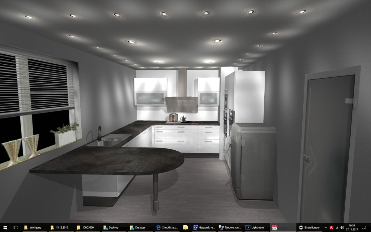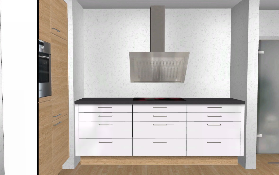 Der Küchenplaner von gestern hatte eigentlich eine Variante wie meine gebastelt, nur dass er die Hängeschränke nicht über dem Kochfeld sondern an der Wand mit der Spüle geplant hatte. Was hältst du davon?