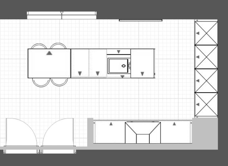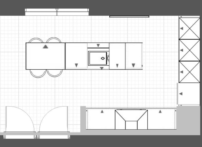 Ich schlage eine Kochfeldnische planunten vor (65cm Mäuerchen bauen, DAH Umluft), die Hochschränke planrechts, mit integriertem Kühlschrank (gibt es auch mit Eiswürfelbereiter, afaik) und einer Spülen- plus Sitzinsel in 75cm Tiefe, so dass ein reiner Durchgang von 75cm planoben bleibt und ein Abstand nach unten und rechts von jeweils gut 100cm.