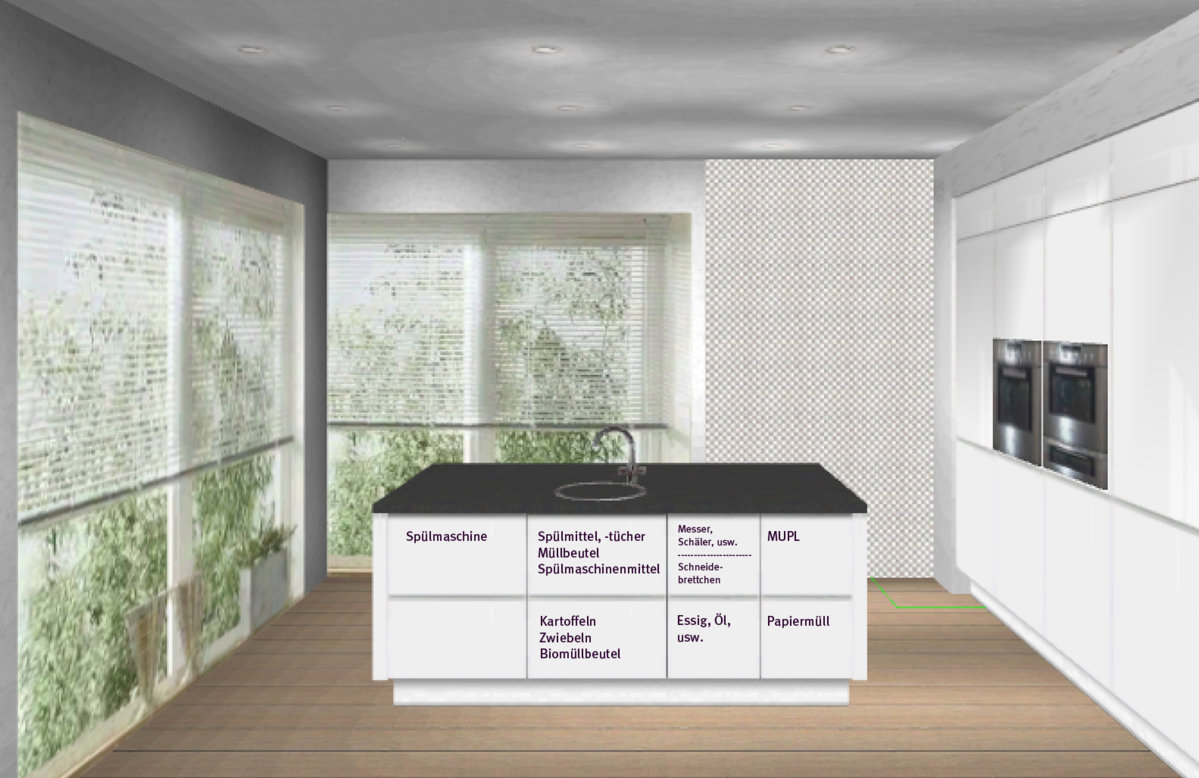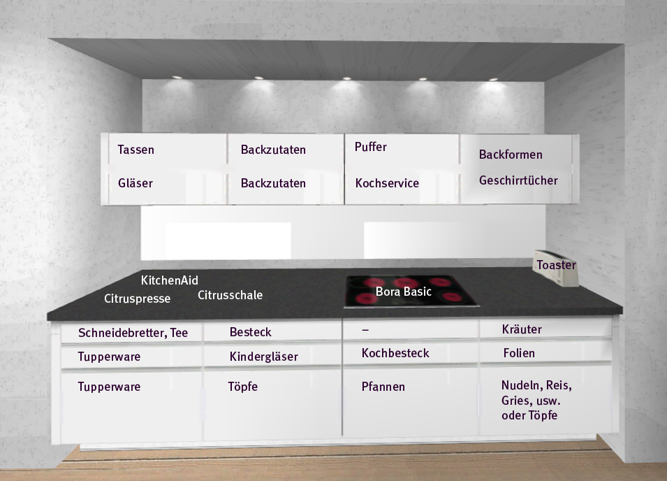 @annette: Wir haben versucht zu clustern, aber wichtiger war uns die Nutzungshäufigkeit. Ist durch die Insel und die Seitenschränke nicht so einfach für alles kurze Wege zu haben.