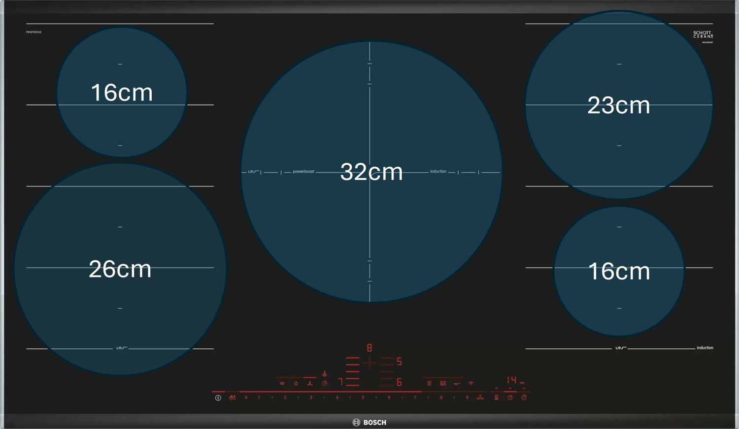 Was aber ohne Probleme passt ist die Kombi - 26/20/16 plus große 28 er Pfanne- eine fünfte Zone bei 80 cm wüsste ich gar nicht wohin (hab ich auch noch nicht vermisst) - hab das 80er induktionsfeld von Bosch PXE801DC1E
