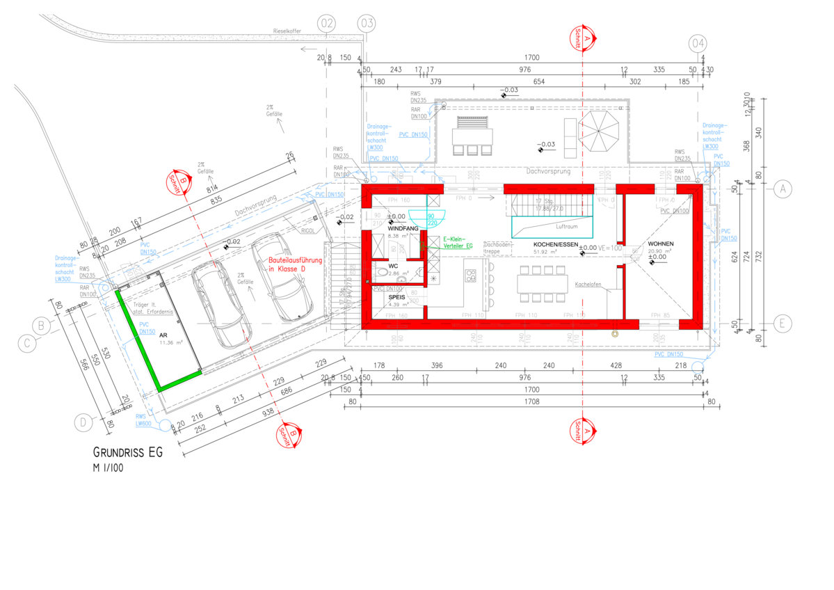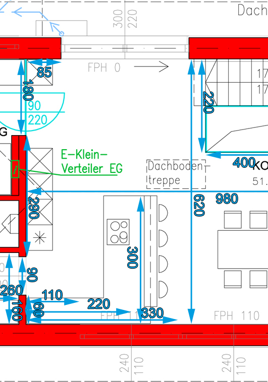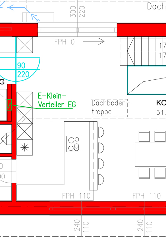 Naja, dereit steht der Rohbau und die Zwischenwände (im Plan rot markiert) sind gemauert. Der Rest - also die Einrichtung von Küche/Esszimmer - ist noch völlig offen und variabel.