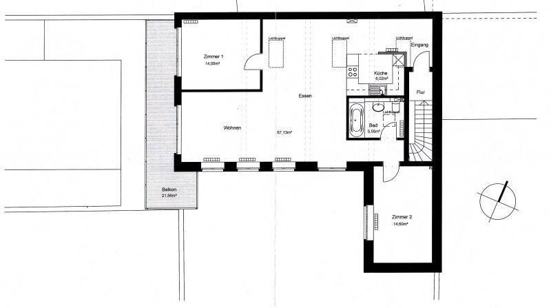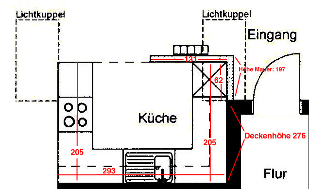 - Die Verkleidung nach oben ist eine von mir geplante Verkofferung zur Abführung der Abluft. Das Abluftrohr sitzt dort, wo in unserem Wohnungsgrundriss das Kochfeld eingezeichnet ist. Ich hänge einen neuen Grundriss an, auf dem das Abluftrohr mit einem roten Punkt vermerkt ist und die Möbel in Blau. Da die Verkofferung nicht unbedingt zur Schönheit der Küche beiträgt, wäre das noch ein Argument zur Umstellung auf Umluft ;-)