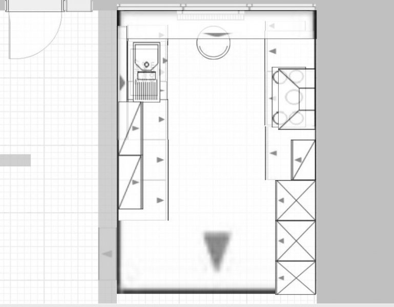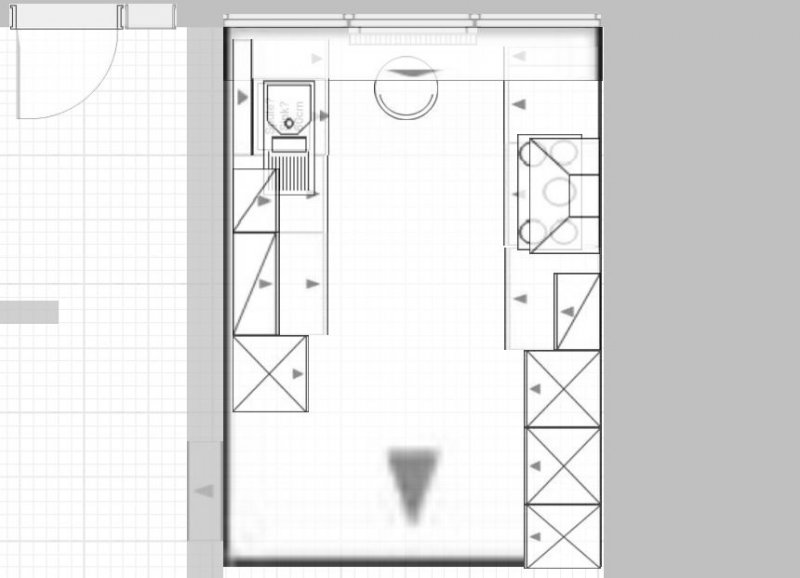 Vorne dann aber keine zwei Schränke, sondern lieber einen Breiten. Dafür mit der Spüle weiter runter, einen nur 60er Spülenschrank und dann kann man den 3-3-Raster Auszugschrnak in der Ecke auch breiter machen und kommt an den Inhalt besser ran, trotz 40cm AP drüber.
