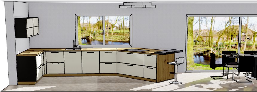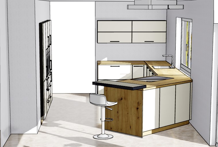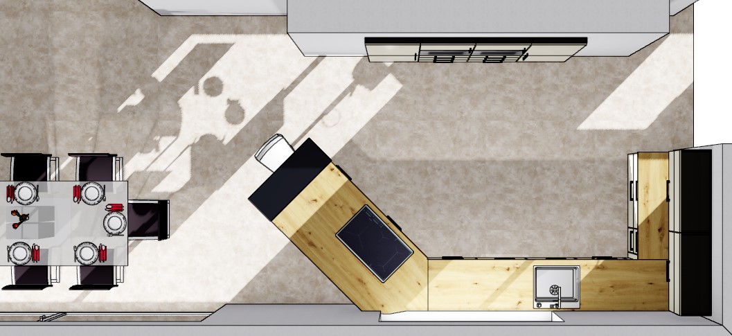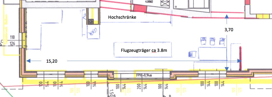 Der Grundriss v00 vom Architekten war aber eine Katastrophe (60cm tiefe Insel, nur 1m Durchgangbreite). Mit v01 bin ich aber leider auch überhaupt nicht zufrieden - hier fehlt komplett die Arbeitsfläche (mit dem Rücken zum Tisch will ich wirklich nicht stehen).
