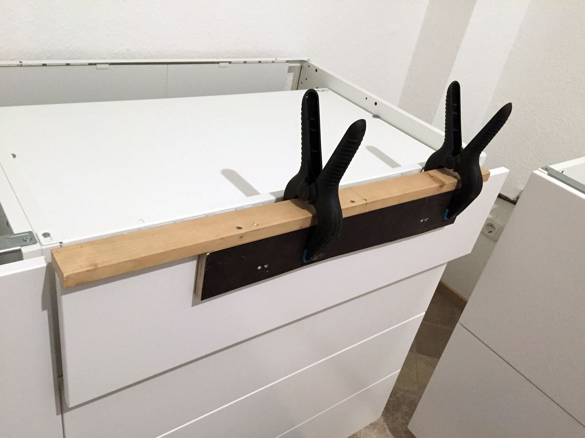 Da reichen aber auch zwei einfache Winkel innen und lange Schrauben hintenraus durch die Rückwand.