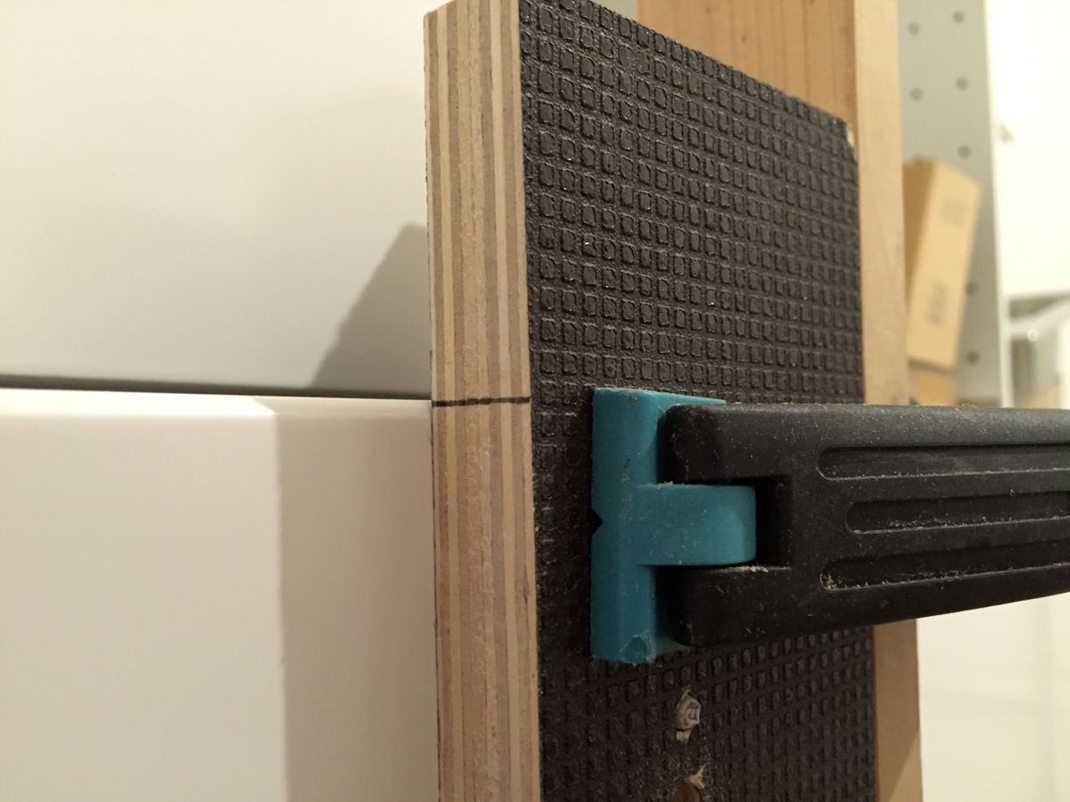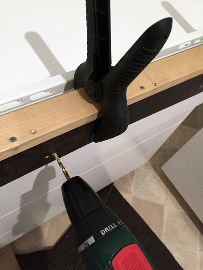 Mit Klemmzwingen laesst sich nun die Schablone schnell und hinreichend stabil an der Schubladen befestigen, so dass das Bohren beginnen kann:
