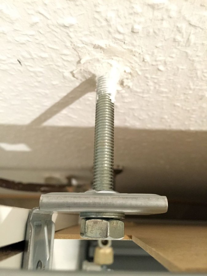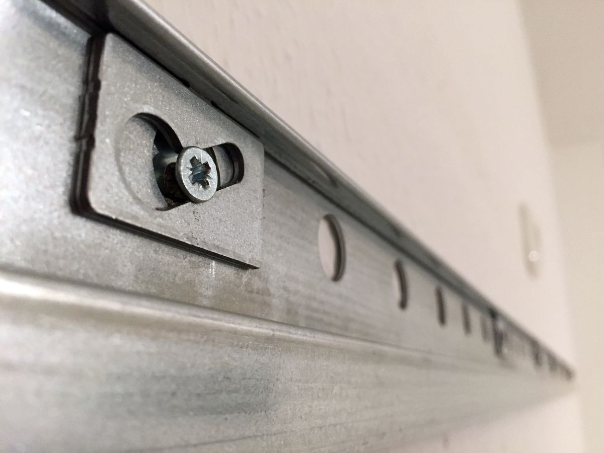 Fuer die Haengeschraenke ist die Wandschiene unbedingt zu empfehlen. Damit lassen sie sich total einfach daran haengen. Allerdings hat mich das Anbringen der Schiene viel Zeit und Nerven gekostet, als ich feststellte, dass die Wand hauptsaechlich aus Sand besteht, und jeder Duebel sofort zu einer Verdopplung des Lochdurchmessers fuehrte. Also musste viel Blitzzement helfen, um die Schiene - hoffentlich sicher und dauerhaft - anzubringen.
