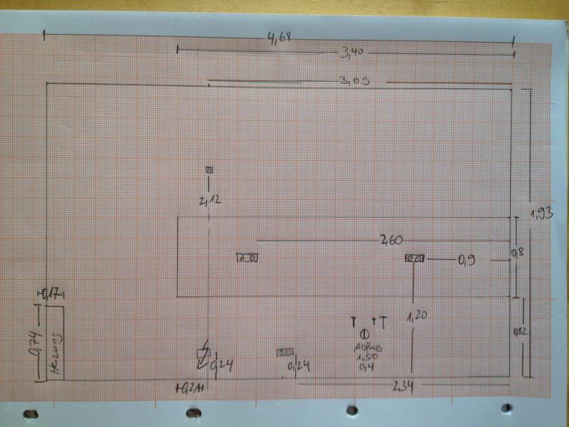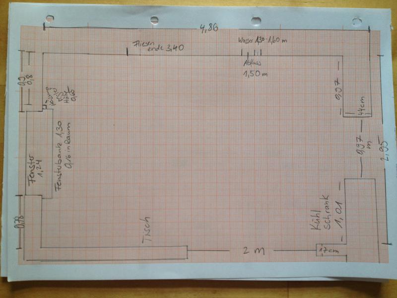 Vielleicht kannst du generell mal einen komplett vermaßten Grundriss einstellen, in dem du alle Wandstücken etc. dort mit ihren Maßen einträgst. Auch den Türdurchbruch zum Nachbarzimmer. So etwas kann man auch auf Papier zeichnen und dann abscannen oder mit der Digicam abfotografieren. Zahlen relativ groß schreiben.