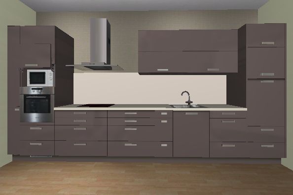 Auf der anderen Seite planoben links habe ich noch einen 80er Auszugsunterschrank entweder wie abgebildet 1-2-3 oder vielleicht sogar mit Raster 1-1-2-2, denn auch in Schubladen kann man viel unterbringen. Ich habe z. B. Servierplatten, Kaffeetassen, Schnapsgläser etc. ;-). Hier denke ich insgesamt als Geschirrschrank, Teller, Tassen, schöne Gläser, Besteck etc. Zusammen mit der Blende wg. der Heizung wird die APL hier ca. 100 cm breit und kann als Abstellfläche für Kaffeemaschine, Obstschale und Toaster dienen. Die Sachen sind somit auch nah am Tisch.