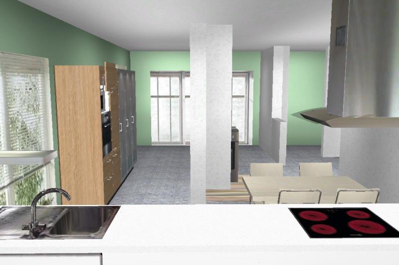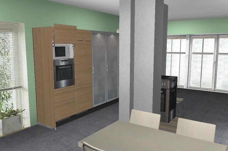Die Hochschränke (Kühl, BO, Vorrat) in eine 58cm tiefe Nische stellen, die mit der Kaminwand gebildet wird. Die Nischenwand könnte nur so hoch wie die Schränke sein, um den offenen Charakter nicht komplett zuzumauern.