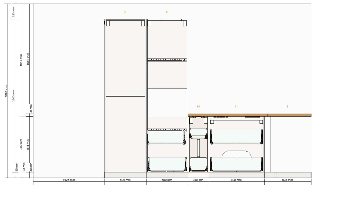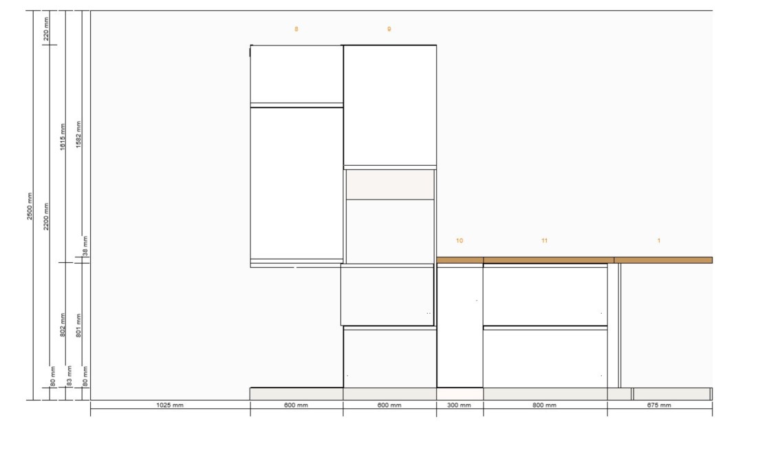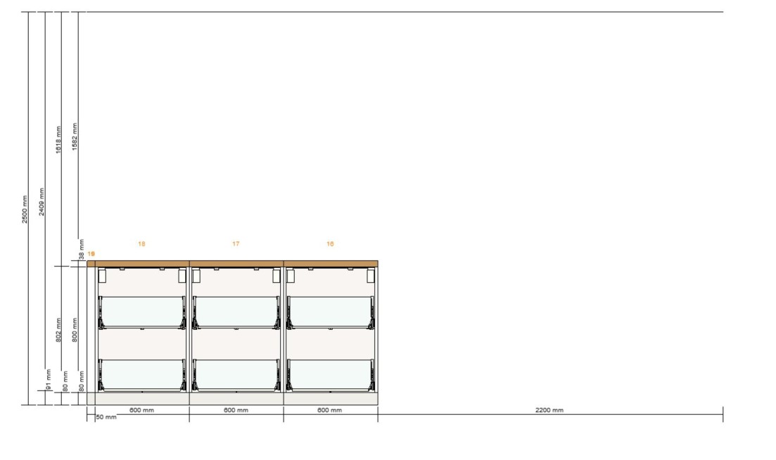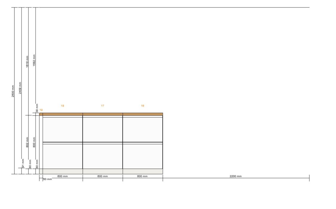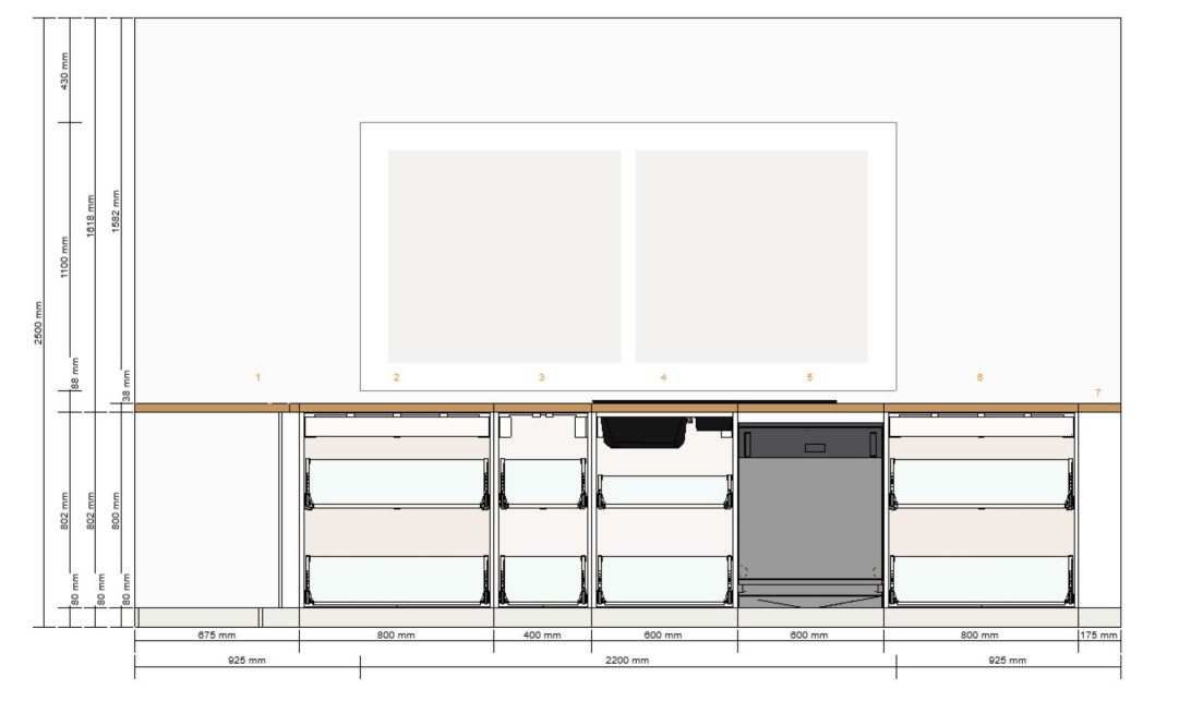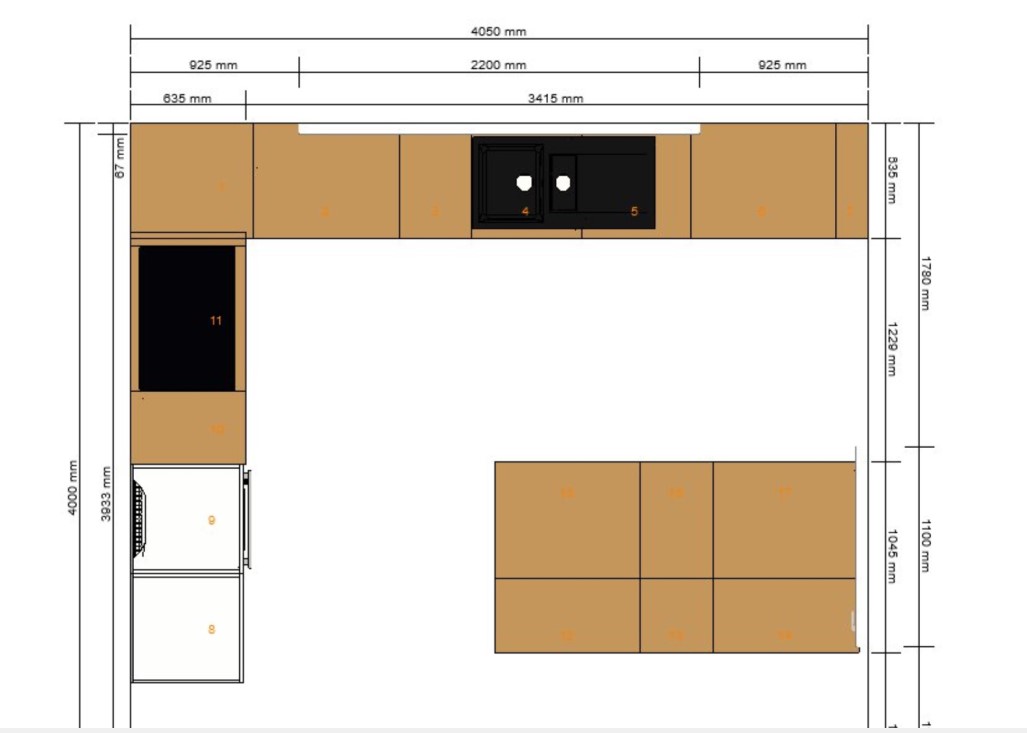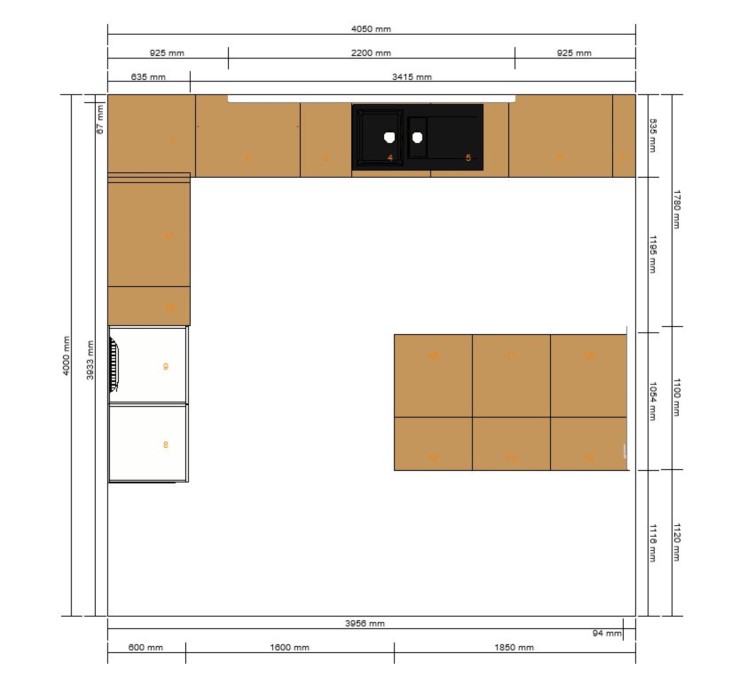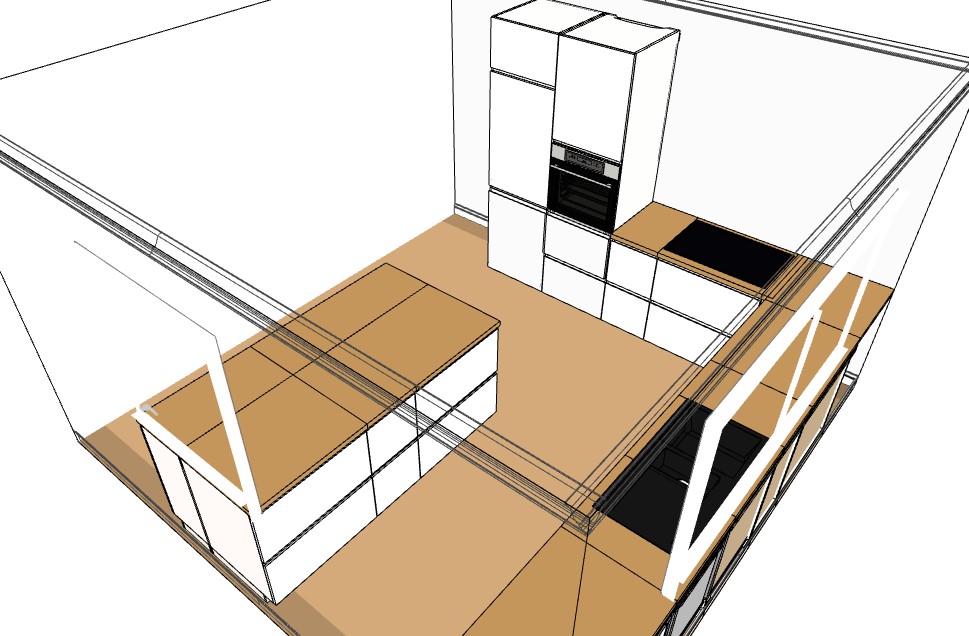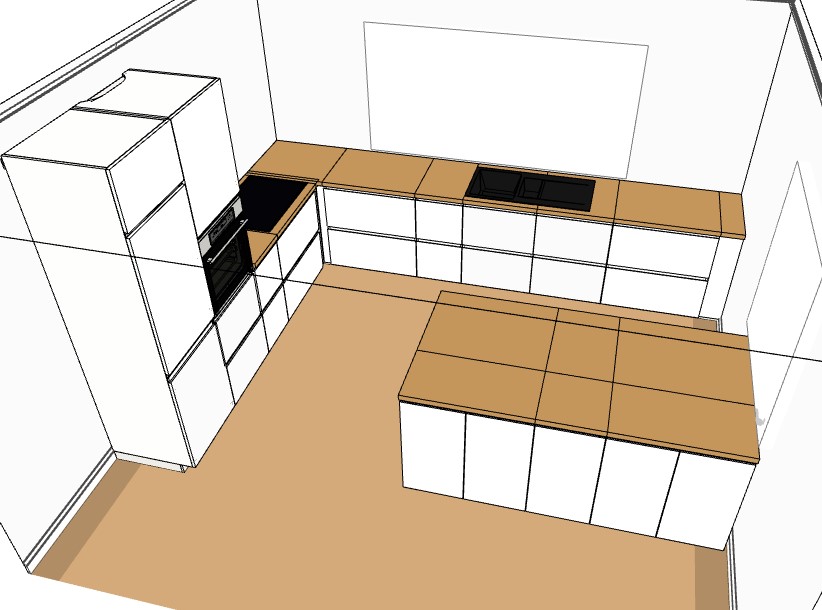 Die 120cm zwischen Insel und Zeile sind gut. Ich würde die Insel allerdings auf 2m ausdehnen mit 2x 1m Schränken. Das bringt euch mehr Stauraum (auch 2x 90cm statt 3x60er wären stauraumtechnisch besser) und sieht ruhiger aus.