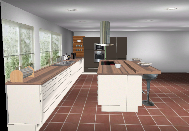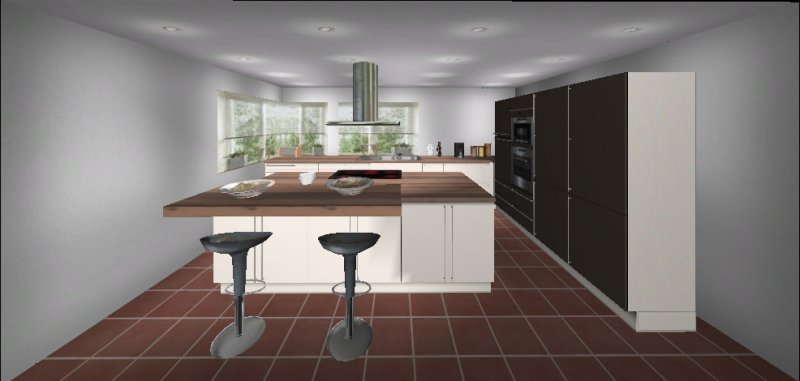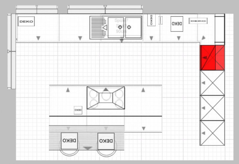 Das Spülbecken würde ich weiter nach Planrechts rücken - so dass max 60cm-80cm zur GSP-Wand bleiben; es ist beim gemeinsamen Kochen sowieso günstiger, wenn Spüle & Kochfeld nicht gegenüber liegen, sondern einen Schritt auseinander.