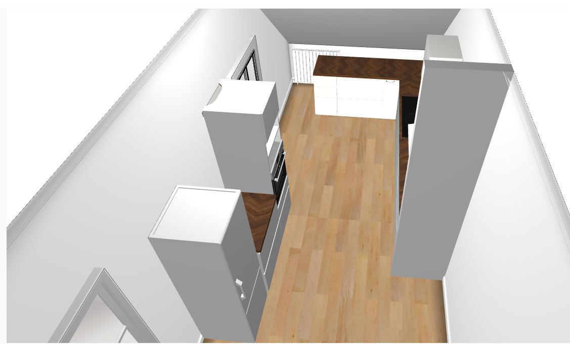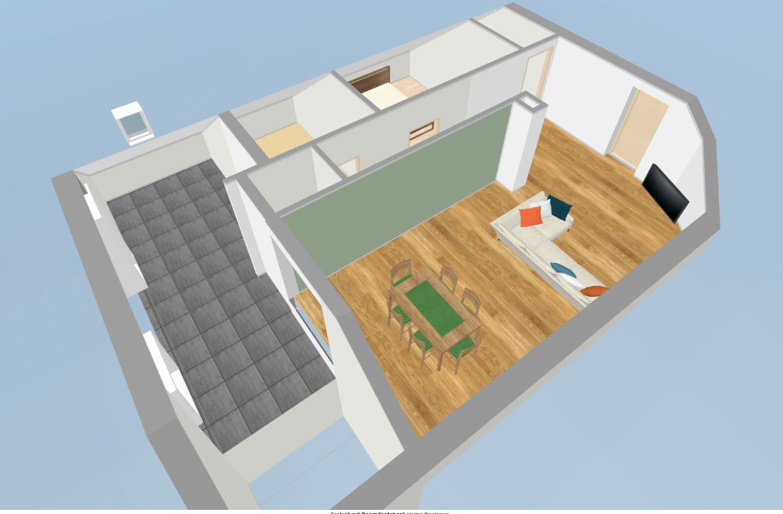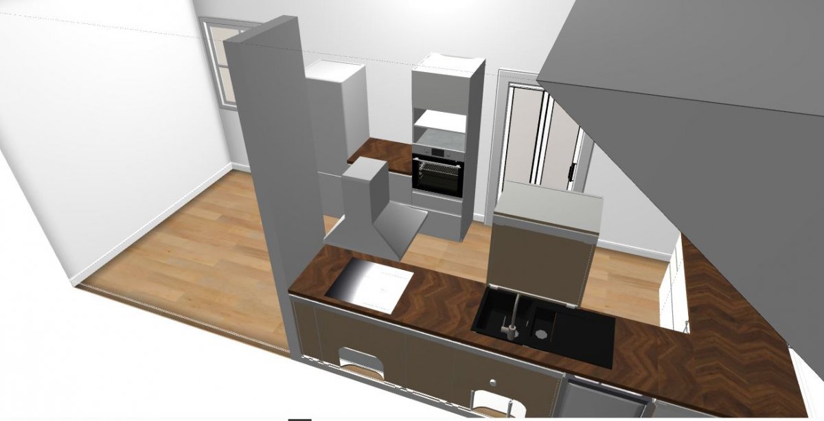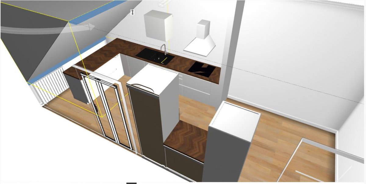 Ebenso bin ich mir nicht sicher, ob an der Wand unter der Dachschräge die Arbeitsfläche bis ganz zur Wand gehen soll, oder etwa unter dem Dachfenster enden soll - dann hätte ich noch einen besseren Zugang zum Heizkörper im Eck.