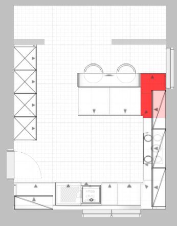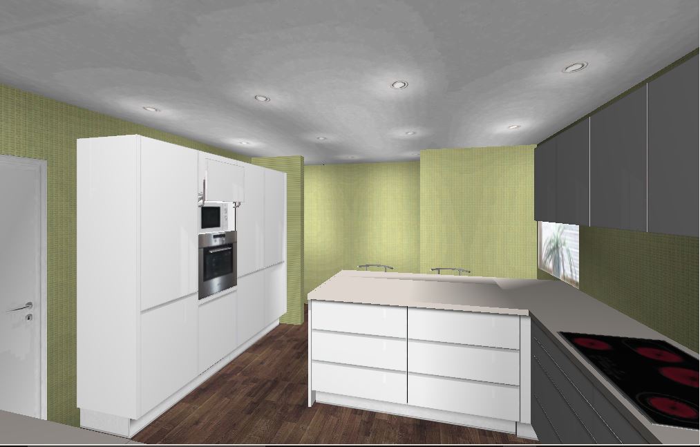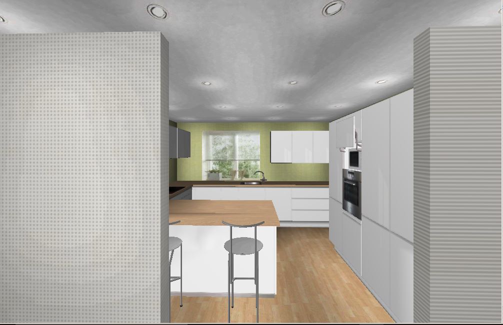 wenn mit Halbinsel, dann vielleicht so. Die Inselschränke sind je 80cm breit und 75cm tief. Die Theke ist 35cm tief, mehr ist nicht erforderlich. In das tote Ecke bei der Theke kann man rückseitig einen 60er US, auch übertief, stellen.