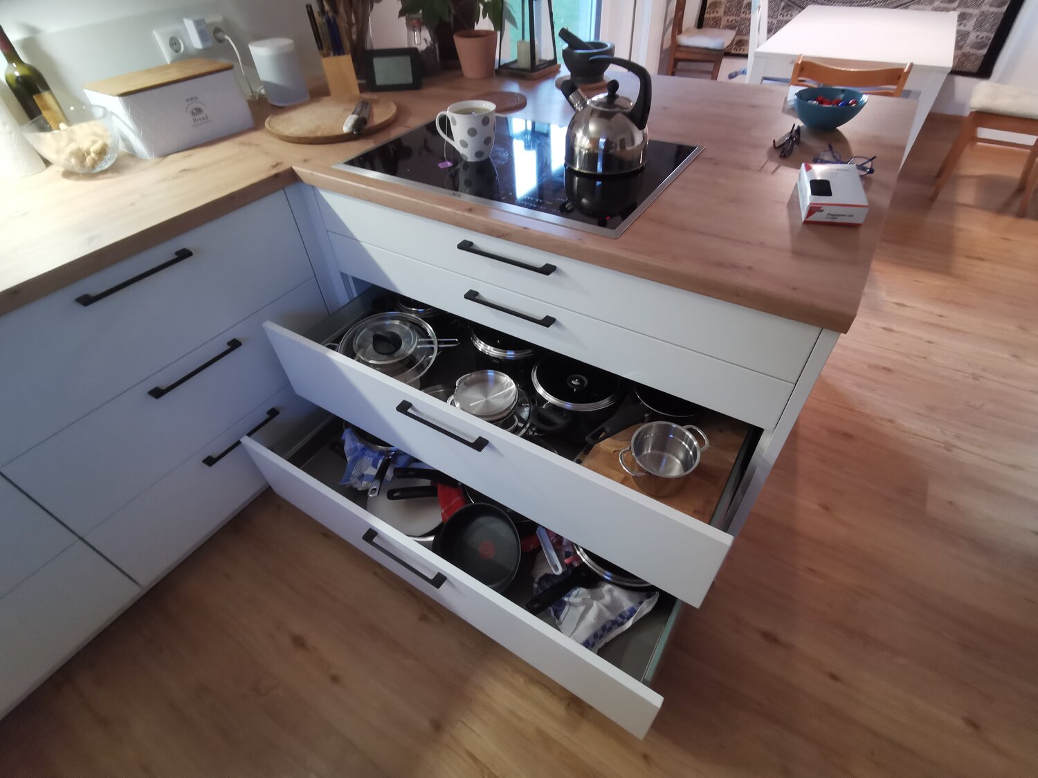 die meisten US in der Häcker Küche haben einen unteren Auszug von 39 cm, einen mittleren von 26cm und eine 13cm hohe Schublade. Die AP ist eine Quartz-Komposit Platte in 2 cm Stärke.