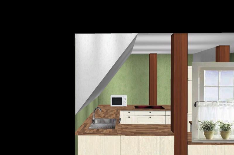 Das KF planlinks an die Wand - gerne im gleichen Stil. Dann geht eine Abluft vielleicht einfacher (Budget!). Die Hochschränke planunten links ab hinter der Tür... Einer muß dann wegen des Balkens bisserl schmaler werden (50-er oder so) und kann bestenfalls als Vorratsschrank... Oder wirklich nur den KS und keine weiteren Hochschränke. Die MW macht aus einem Schrank eh automatisch einen halbhohen Schrank.