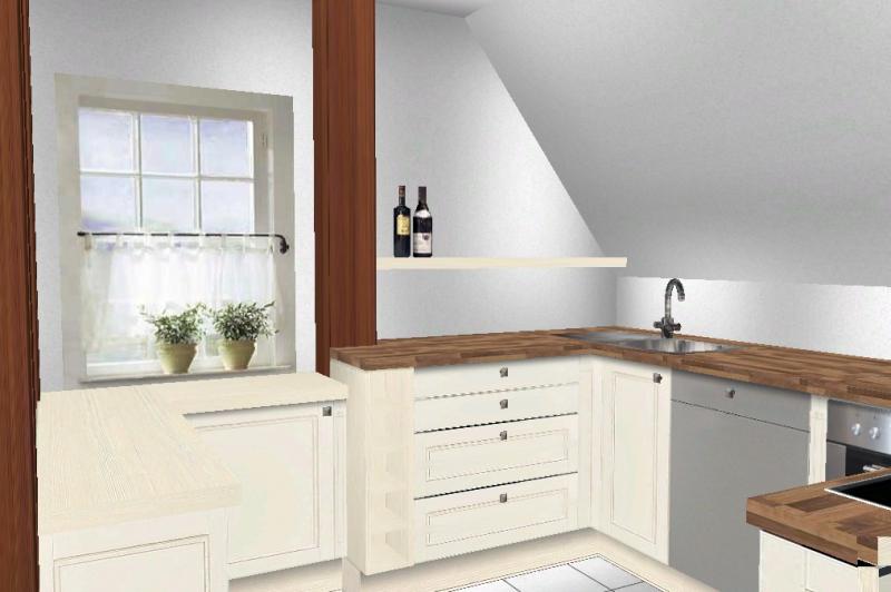 Du könntest die unterschiedlichen Höhen und Tiefen sogar extra betonen durch zwei verschiedene Arbeitsplatten : einmal die "Arbeitsküche" mit der höheren AP, und am Fenster und Durchgang die "Zusatzküche", wo zB eine Obstschale stehen kann.