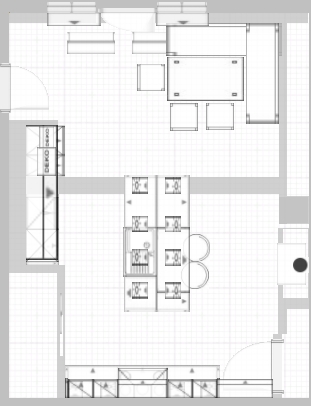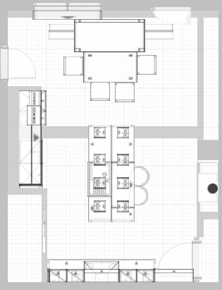 - breiter Gang rechts von der Insel (Planaufsicht), der damit auch Abstand zum heißen Ofen gibt, wenn dieser in Betrieb ist.
