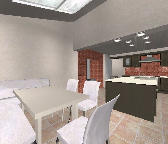 Wir haben auch nocheinmal ueber die Aufteilung gesprochen und wir moechten bei unserer ersten Idee bleiben, das heisst wir wollen den wohnlichen Bereich im hinteren Teil mit Eckbank und die Kueche im oben Teil sprich Anbau.