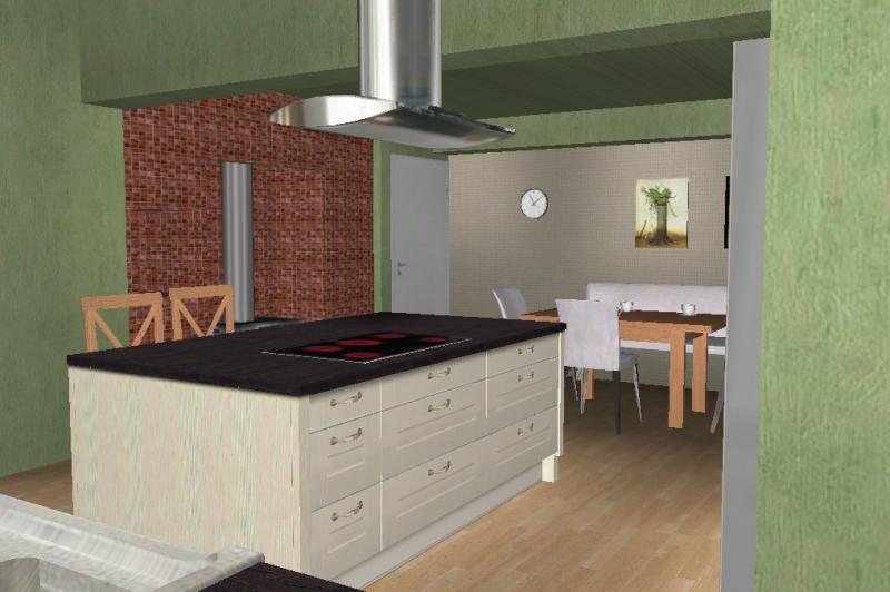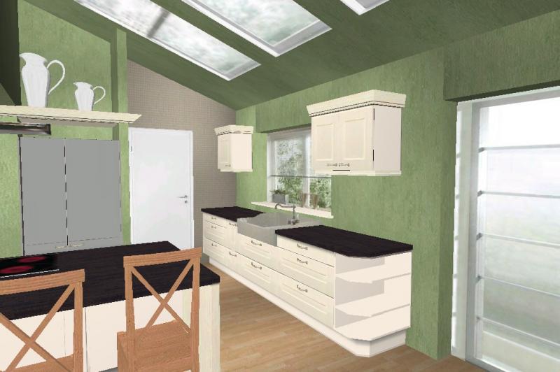 Diese Planung beruht ja auf einem Küchensofa ähnlich meinem. Wenn man dort sitzt, sieht man durchaus etwas vom Ofen. Hat aber auch den schönen hellen Sitzplatz zum Zeitungslesen etc. Der Tisch kann problemlos verlängert werden. Hier sieht man auch die Verkleidung über den Hängeschränken am Kochblock. Dort läuft der Abluftkanal.