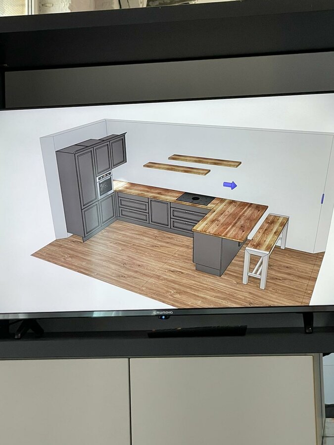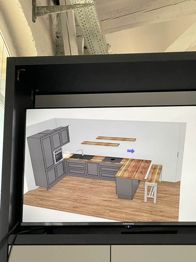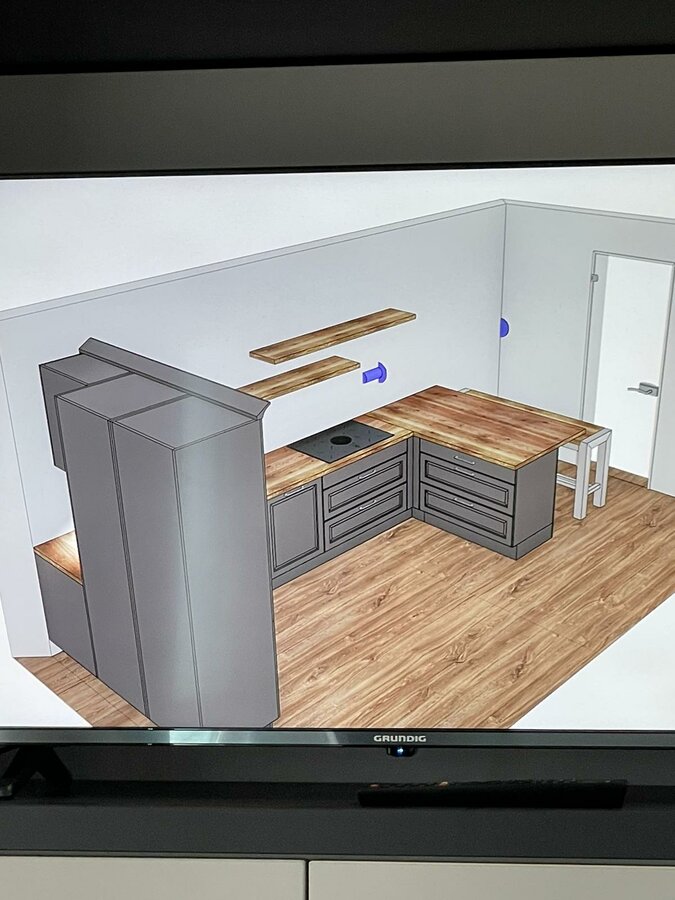 Wir haben uns schon mal eine Musterküche angeguckt, die größer war und hatten auch schon eine erste angepasste Planung und wollten bei der zweiten Planung gucken, wie es ausschaut, wenn wir mit den Möbeln die Wand zustellen und nicht wie ursprünglich eine U-Form mit Theke und Hocker. Allerdings waren wir dann so zufrieden mit unserem aktuellem Küchenfachberater, dass wir es gelassen haben.