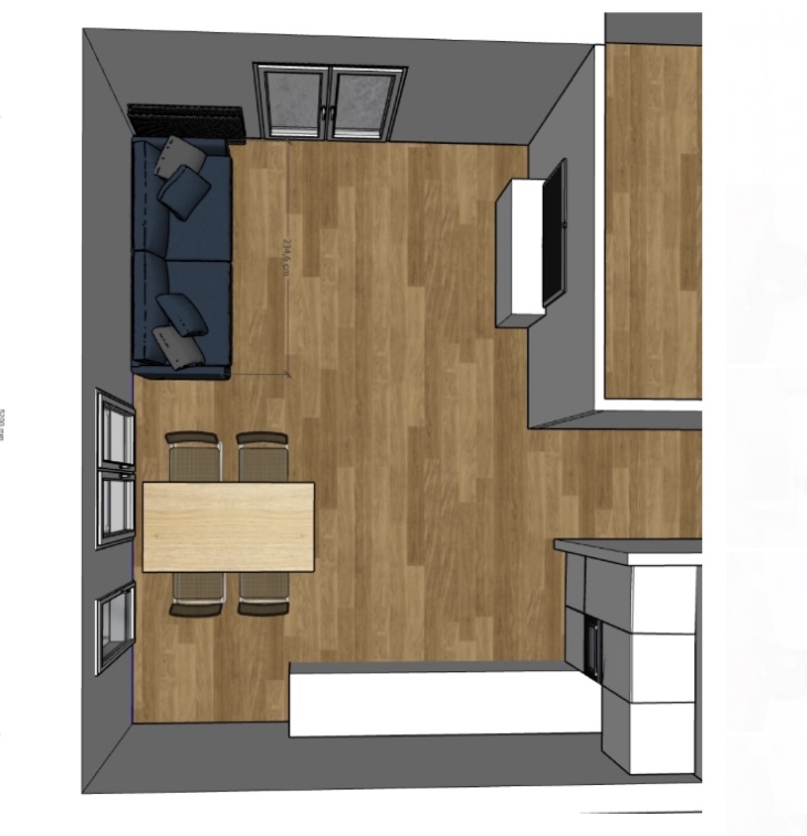Eine Couch, wir haben mit einer 234cm langen geplant. Aktuell haben wir eine zu große Eckcouch, die 340 lang ist und auch die Tiefe der Recamiere ist in dem Raum nicht machbar.