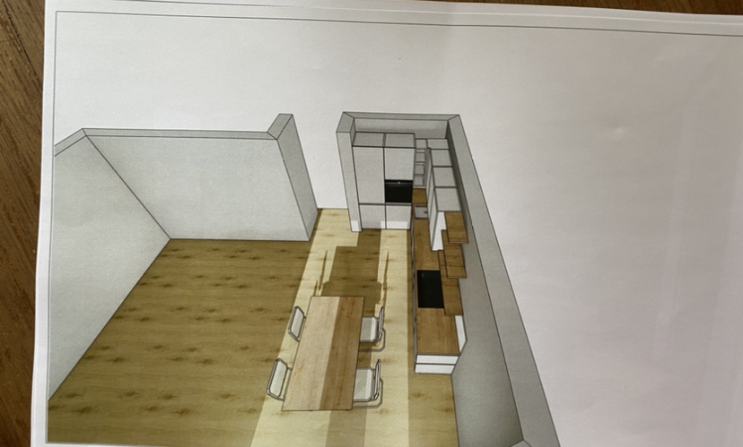 Dann eine Planung mit Sketchup mit den wichtigsten Möbeln (hier ist die Zeile allerdings ca 30cm kürzer als die Planung vom Küchenstudio ).