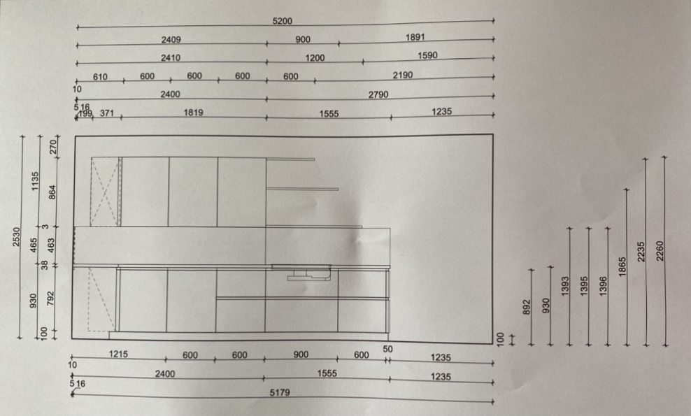 Wenn wir zum zweiten Termin hingegangen wären, hätten wir das U, wie im Bild ersichtlich weggelassen, und eine Zeile gemacht. In der Theke versteckt ist auch noch ein 60 US an der Wand, der übriggeblieben ist, wenn wir denn die Option mit der Theke gewählt hätten. Die großen Schränke sind 100er.